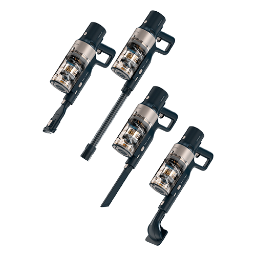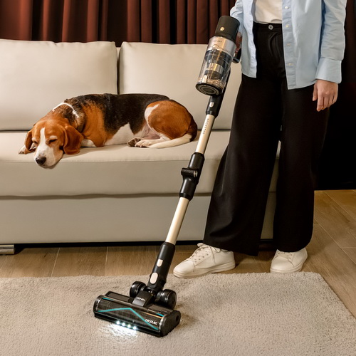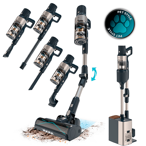 Aspirador escoba sin cable y con base de autovaciado. 220 AW y 700 W. Tubo flexible y ciclón paralelo. 90 minutos de autonomía en modo Eco. HairLess Brush, cepillo antienredos. Accesorio especial para mascotas.