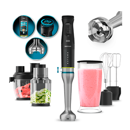 Batidora de inmersión con 1500 W y pantalla digital. Tecnología TotalDestroy con 4 cuchillas recubiertas de titanio negro que trituran ingredientes más duros en menos tiempo. PerreoMove, que mueve las cuchillas arriba y abajo para batir más con menos esfuerzo. Pie XL extra largo, campana antisalpicaduras, selector de velocidad progresivo con función Turbo y un set completo de accesorios con procesador de alimentos y espirilizador.