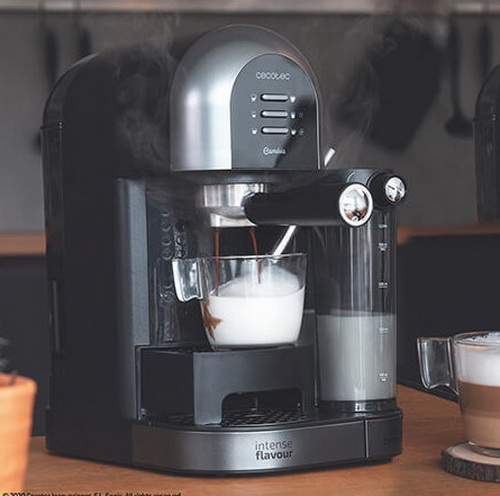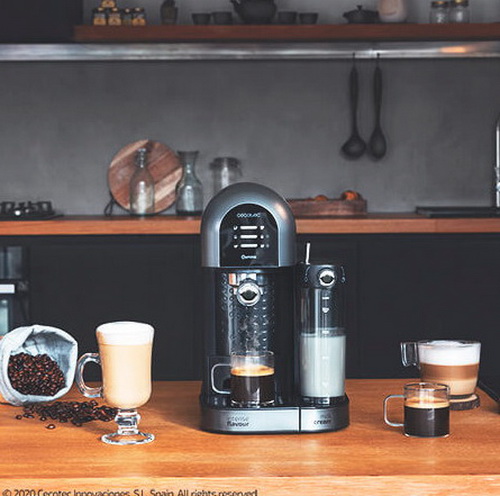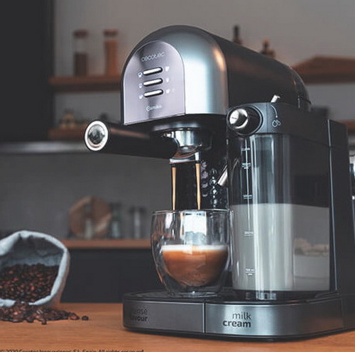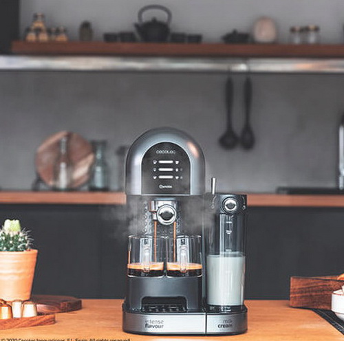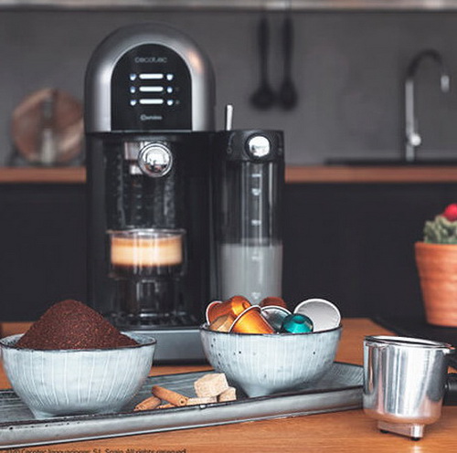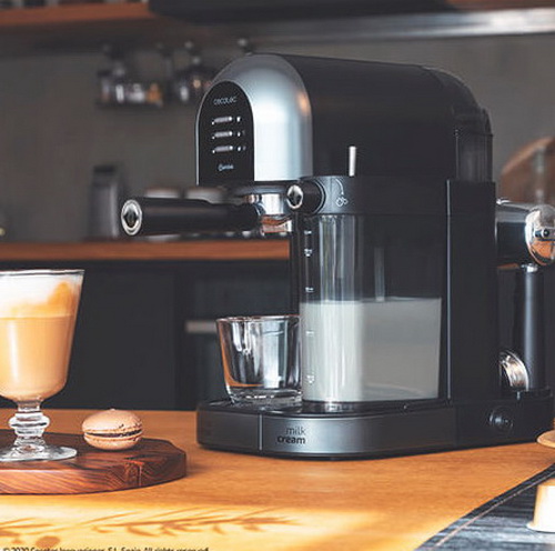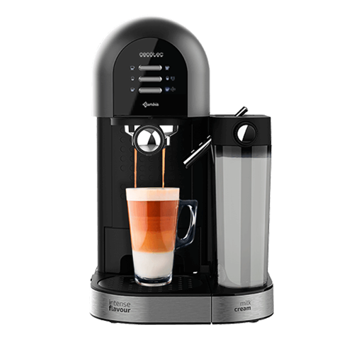 Cafetera semiautomática Power Instant-ccino 20 Chic Serie Nera de Cecoteccon tanque de leche para disfrutar de los mejores espressos y cappuccino con un toque. Es apta para café molido y café en cápsulas, se adapta a todos los gustos. Gracias a sus 20 bares consigue la mejor crema y el máximo aroma en cada café.