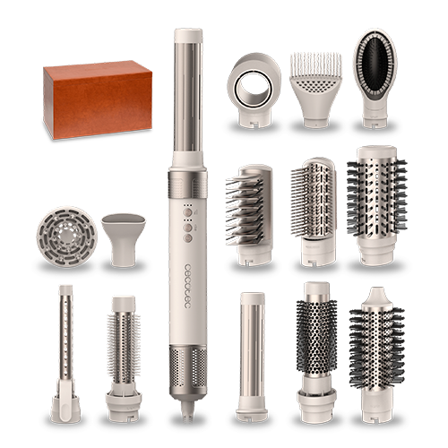 Moldeador multifunción 14 en 1 con tecnología Coanda que moldea, riza, peina, seca y elimina el efecto frizz. Con 3 velocidades, 3 temperaturas, y control inteligente del calor. Motor digital 1400 W de potencia y 110000 rpm. Cabezales con revestimiento de cerámica y keratina.