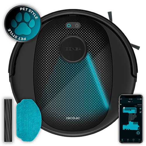 Robot aspirador con tecnología de navegación láser. Limpieza 4 en 1: barre, aspira, friega y pasa la mopa. Potencia de succión de 5000 Pa. Hasta 220 minutos de autonomía. Cepillo central de silicona, óptimo para pelo de mascotas. Mopa de fregado y 1 cepillo lateral. Control APP y asistentes virtuales. Conexión Bluetooth y WiFi para redes 2,4 GHz y 5 GHz.